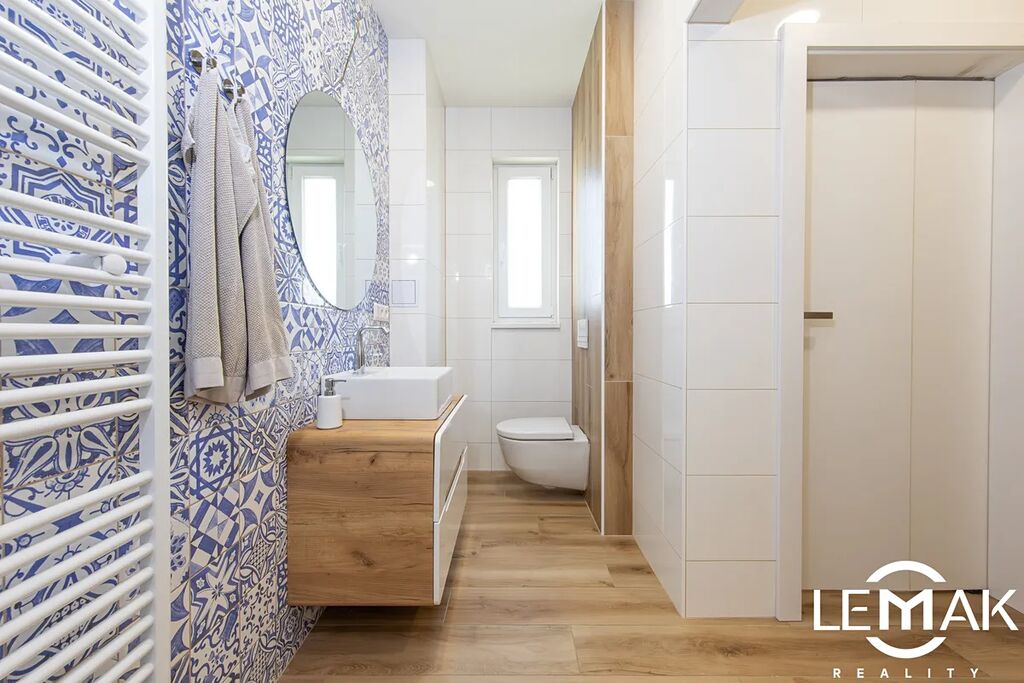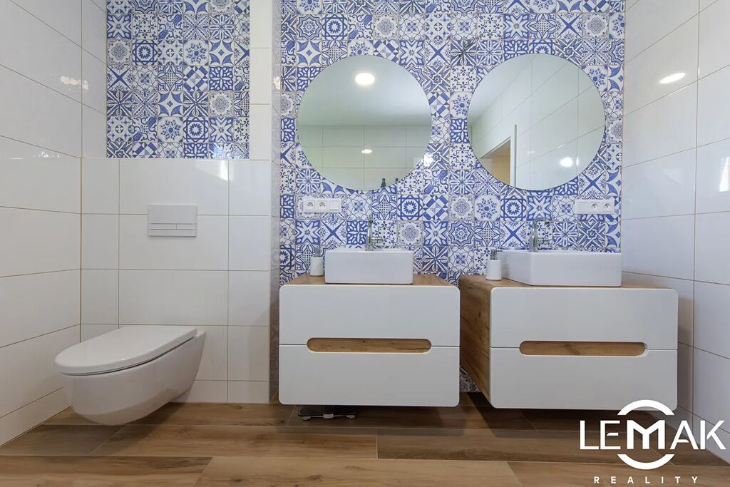 Osvětlení značky Eglo a italská keramika v koupelnách dodávají prostoru elegantní vzhled.