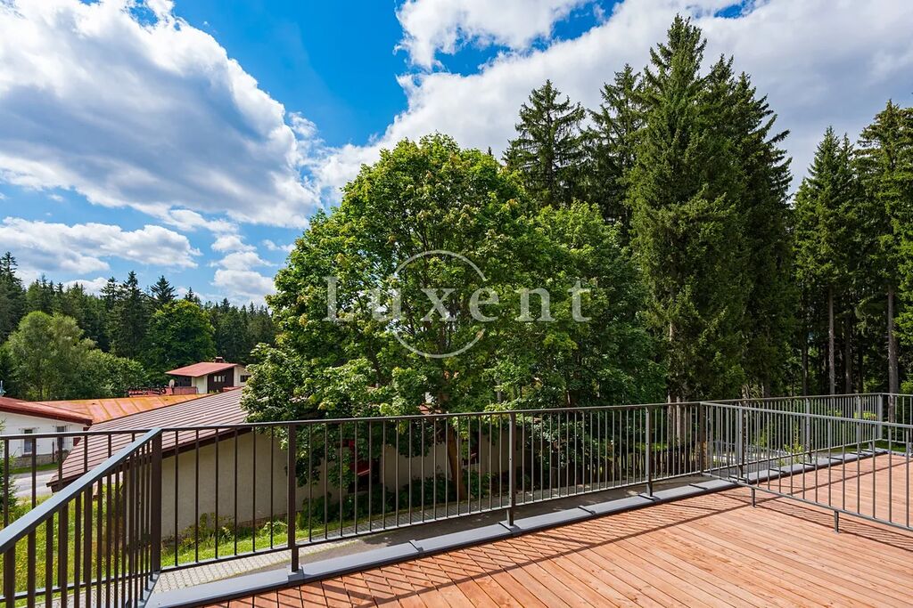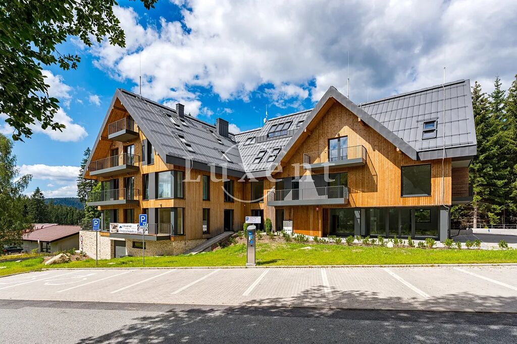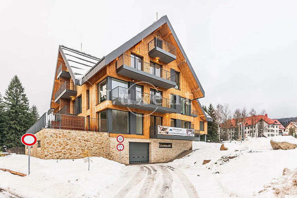 Nabízíme plně vybavený apartmán o dispozici 1-2+kk v 1.NP luxusního projektu HARRACHOV PEAKS. Apartmán má obytnou plochu 52,19 m² a celkovou užitnou plochu 80,16 m² vč. prostorné terasy (27,97 m²). Projekt je dokončen a zkolaudován a byt je jako vzorový vybaven zařízenou kuchyní (spotřebiče BEKO) a skříňovou vestavbou oddělující spací a jídelní kout, která apartmán přibližuje dispozici 2+kk. Rovněž chodba je vybavena vestavěnou skříní a komorou. V suterénu je majitelům apartmánů k dispozici wellness se saunou a vířivkou a vybavené fitness.