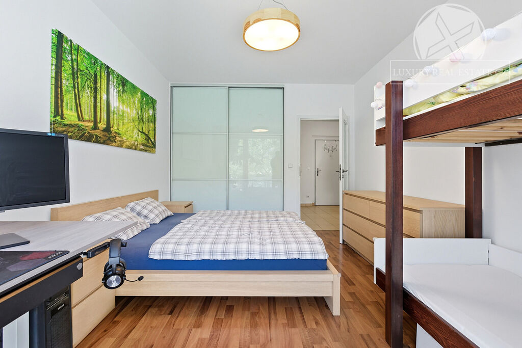 Dispozičně velmi praktické uspořádání bytu, přímý vstup přes terasu na vlastní krásnou zahrádku lemovanou vzrostlými stromy, terasa vybízející k relaxaci a posezení s přáteli, JV orientace oken zajišťující dostatek denního světla, příjemné klima v bytě zajišťující klimatizace a spousta dalších benefitů čeká na nového majitele.
