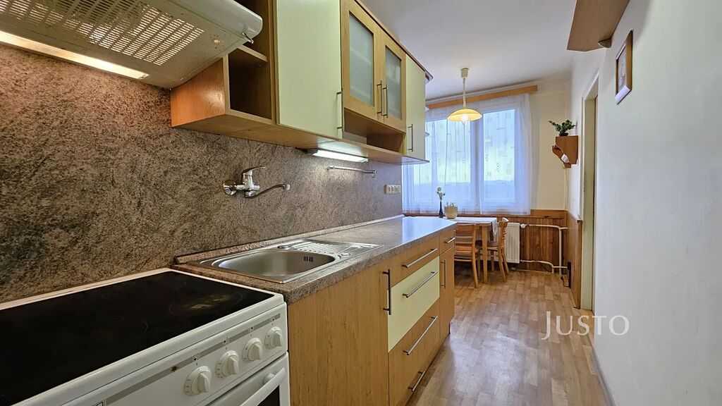 Dispozice bytu nabízí prostorný obývací pokoj (16,2 m²), dva samostatné pokoje (ložnice a dětský pokoj, každý 12,3 m²), kuchyň s jídelní částí (11,1 m²) a předsíň (5,6 m²) s praktickým úložným prostorem/komorou (2,1 m²). Byt je částečně vybaven a připraven k nastěhování či případné modernizaci dle vlastních představ. K bytu náleží sklep, což oceníte pro další možnosti uskladnění.