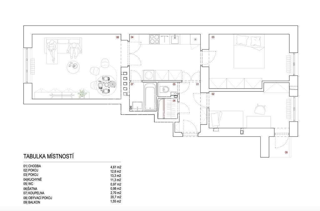 Interiér prošel kompletní renovací – majitel si dal záležet na detailech. Na podlahách jsou krásné parkety, nová kuchyňská linka nabízí plno úložného prostoru, koupelna s vanou je designově sladěná a WC je oddělené. Obě ložnice jsou orientované do vnitrobloku (jedna má balkon, druhá velkou vestavěnou skříň), obývací pokoj je směrem do ulice.