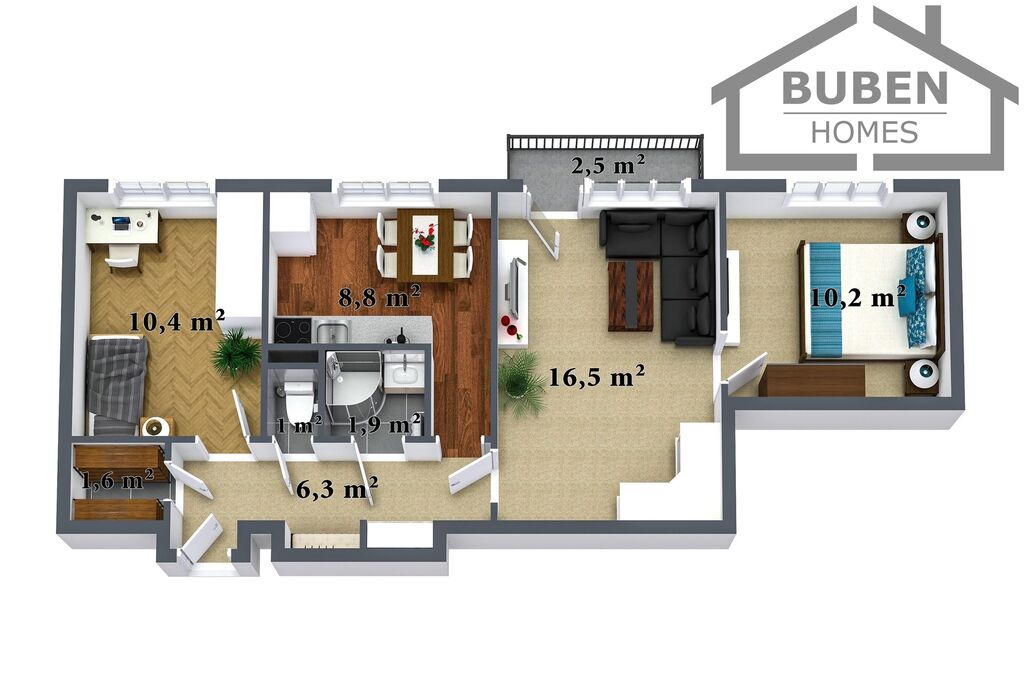 Byt tvoří prostorná vstupní chodba s vestavěnou skříní a komorou, kuchyň, prostorný obývací pokoj (17,22m2) se vstupem na balkon, dvě ložnice, koupelna se sprchovým koutem a samostatné WC. Bytová jednotka je v původní, ale v zachovalém stavu. Bytové jádro je umakartové. Koupelna prošla částečnou rekonstrukcí v roce 2021 (sprchový kout, podlahové krytiny, odpady, výmalba). V bytě je částečně natažená nová elektřina a částečně obnovené podlahové krytiny. Okna a balkónové dveře jsou plastová. V roce 2025 byly osazeny nové vchodové dveře.