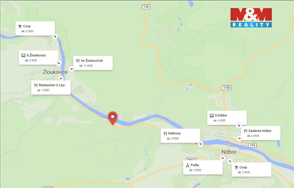 Prodej pozemku, louky, o rozloze 1665 m2, který se nachází na břehu řeky Berounky, v místech mezi Nižborem a Žloukovicemi. Pozemek je jen mírně svažitý. Velkou výhodou je příjezd přímo k pozemku po asfaltové cestě, vhodné i pro karavany. Pokud rádi rybaříte, vyhledáváte klid nebo si chcete jen tak odpočinout v blízkosti řeky Berounky, obklopeni kouzelnou přírodou, je tento pozemek ideální volbou. Cca 100 m od pozemku se nachází malá půjčovna loděk Blackfoot. Veškerou občanskou vybavenost lze najít v nedalekém Nižboru, stejně jako turistické atrakce např. zámek Nižbor nebo restauraci známého herce Tomáše Hanáka „Zastávka Nižbor“. Dojezd autem Beroun - 15 min., Praha Zličín - 35 min. Více informací u makléře.