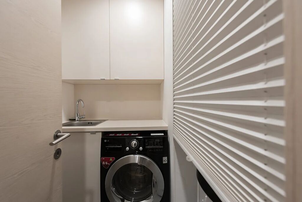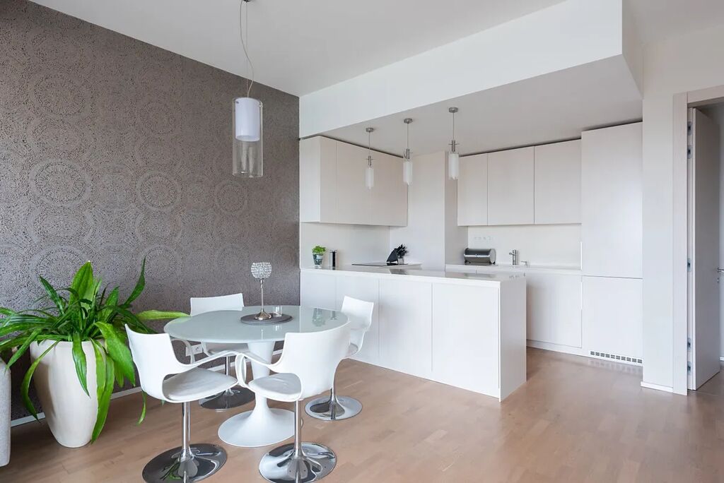 Vše velkoryse řešené, dotažené do detailu, reprezentativní a zároveň účelné a kompletně vybavené (veškeré vybavení na fotografií je součástí pronájmu, včetně pračky se sušičkou). Uvnitř vás čeká velkorysý obývák s kuchyňským koutem (celých 40 m²!). Kuchyň je kompletně vybavená – lednice, trouba, myčka, varná deska, digestoř a hlavně dostatek pracovní i úložné plochy.
