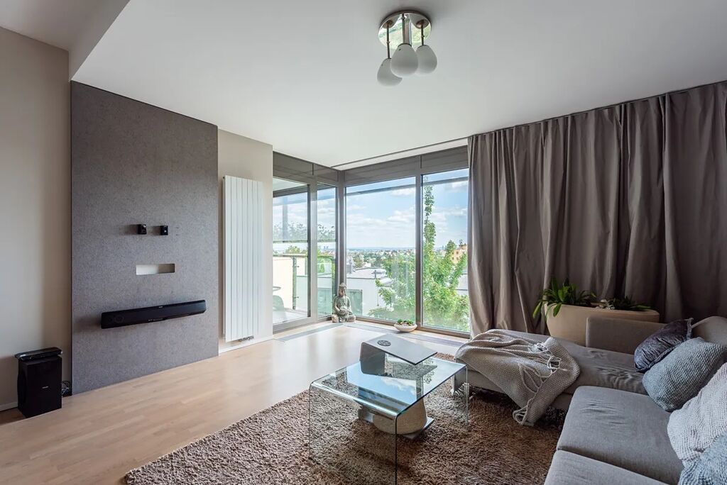Dřevěné podlahy, vysoké dveře, designové tapety, elegantní závěsy a velká panoramatická okna s jižní orientací jsou už jen třešničkou na dortu. Malá terasa, na kterou se vstupuje z obou místností, nabízí dostatek soukromí, místa na pěstování bylinek a máte připravené již posezení s volným výhledem na smíchovské kopce.