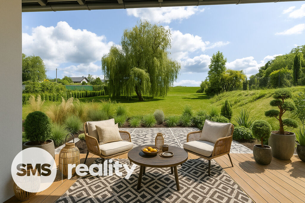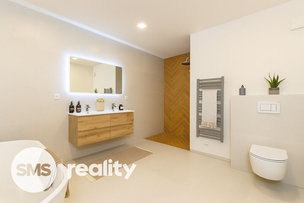 Jednopodlažní dřevostavba zaujme promyšlenou dispozicí a příjemnou atmosférou. Po vstupu vás přivítá prostorná veranda s místem pro vestavěnou skříň i botník. Na pravé straně se nachází světlý obývací pokoj propojený s kuchyní, tvořící srdce domu, odkud vede velkoformátový HS portál na slunnou terasu se zahradou. Na levé straně najdete čtyři samostatné pokoje, technickou místnost a elegantní koupelnu vybavenou vanou, sprchovým koutem i toaletou. Toaleta pro hosty je umístěna naproti verandě, což zaručuje soukromí ložnicové části.