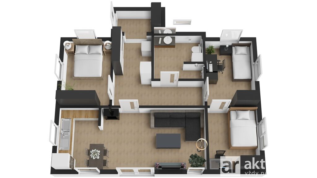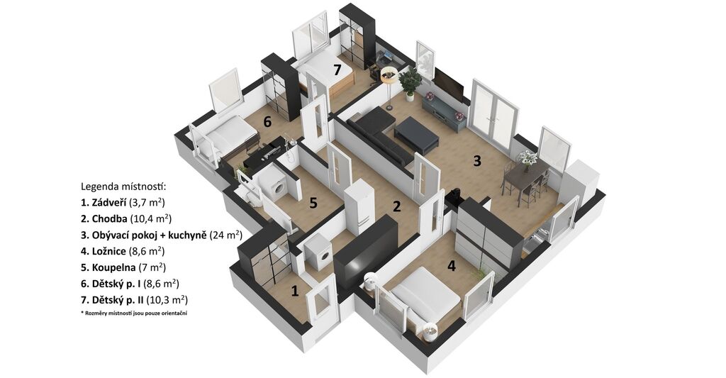 Dispozice 4+KK a vybavení (66 m² podlahové plochy)