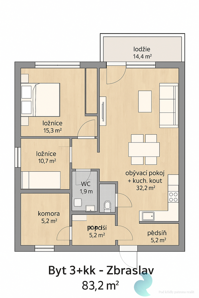 Byt o užitné ploše 83,2 m² je doplněn o balkon o velikosti 14 m² a lodžii 4 m², které poskytují dostatek prostoru pro posezení, relaxaci či pěstování zeleně. Jednotka je vzdušná, světlá a nabízí komfortní uspořádání vhodné pro rodiny i náročnější uživatele.