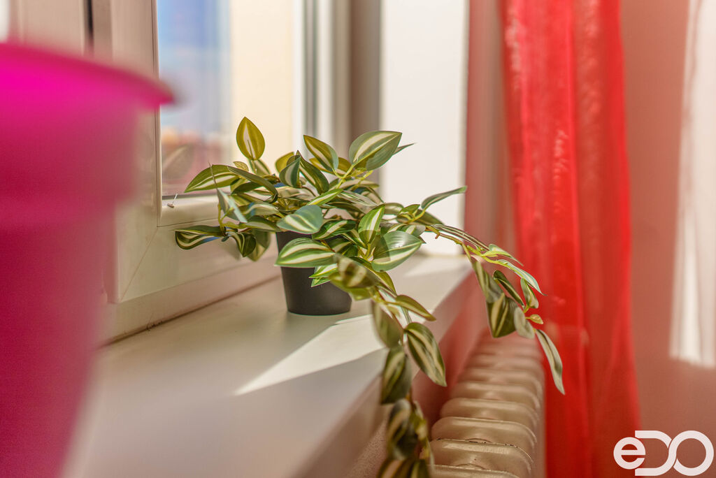 Okno je také v centrální části bytu, kde se nachází kuchyně s koupelnou a toaletou. Tato část bytu je tvořena nenosnými příčkami, což umožňuje velmi flexibilní úpravy – například propojení kuchyně s obývacím pokojem, vytvoření větší koupelny nebo zcela nové řešení jádra.