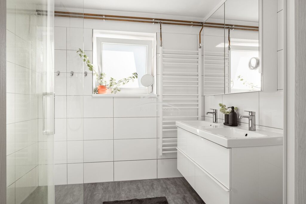 Součástí nemovitosti je také rozsáhlá samostatná a plně vybavená dílna o užitné ploše přibližně 100 m², která představuje velkou přidanou hodnotu pro podnikání, servisní činnost nebo technické hobby. Dílna je zateplená, vytápěná, má vlastní elektroměr a připojení 220/380 V, což umožňuje provoz energeticky náročnějších strojů. Je vybavena hydraulickým zvedákem, díky čemuž se výborně hodí pro autoservis nebo podobné řemeslo. Nechybí zde sociální zázemí, samostatná kancelář vhodná pro administrativu či zákaznické zázemí, dále sklad, půda na uložení materiálu a příprava na další koupelnu, což rozšiřuje možnosti budoucího využití. Před dílnou se rozkládá velká vydlážděná plocha, ideální pro parkování více vozidel, manipulaci s materiálem či skladování. Přístup je komfortní díky vysokým posuvným vratům s výškou 330 cm, která umožňují bezproblémový vjezd dodávek i větších vozidel včetně obytných aut.