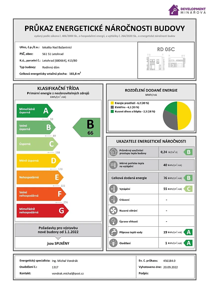 • Úsporná dřevostavba (energetická třída B) – mimořádná tepelná izolace, tepelné čerpadlo vzduch/voda s ovládáním přes aplikaci
