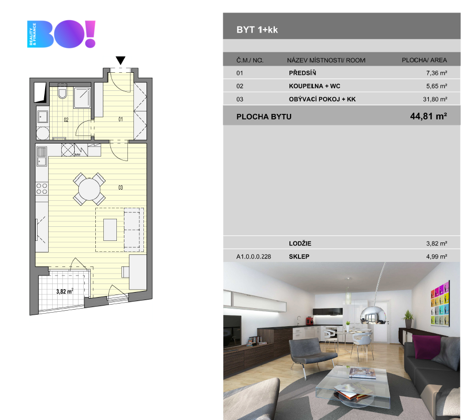 Byt o podlahové ploše 45 m² s lodžií 5 m² je šikovně dispozičně řešen tak, aby nabízel dostatek prostoru pro komfortní život.