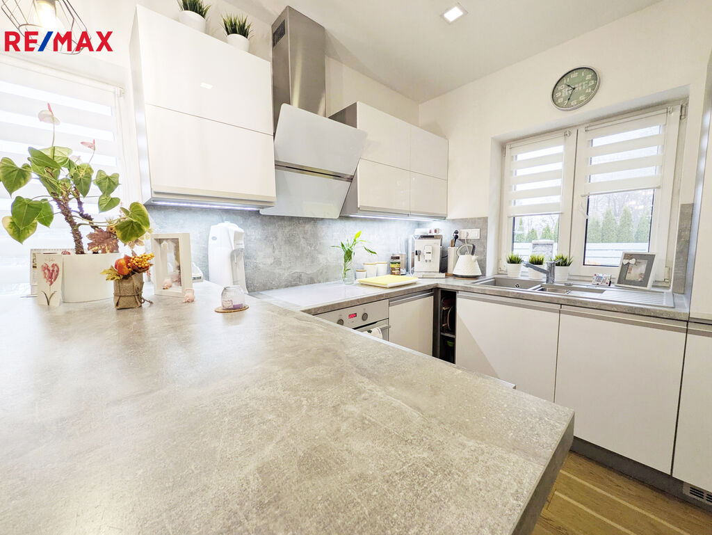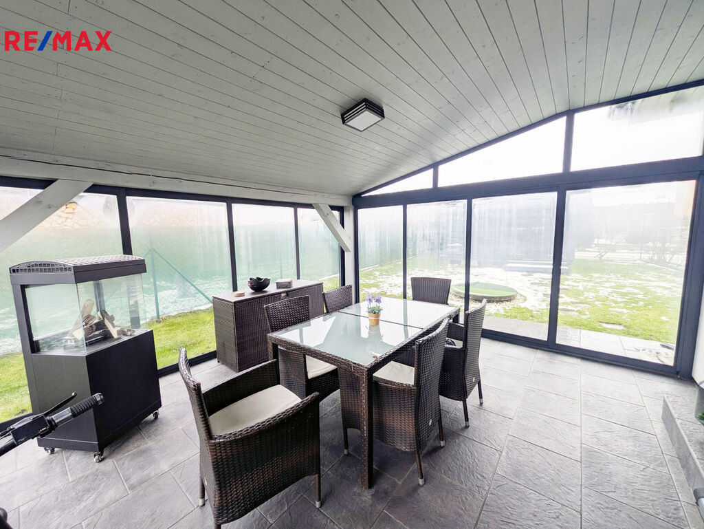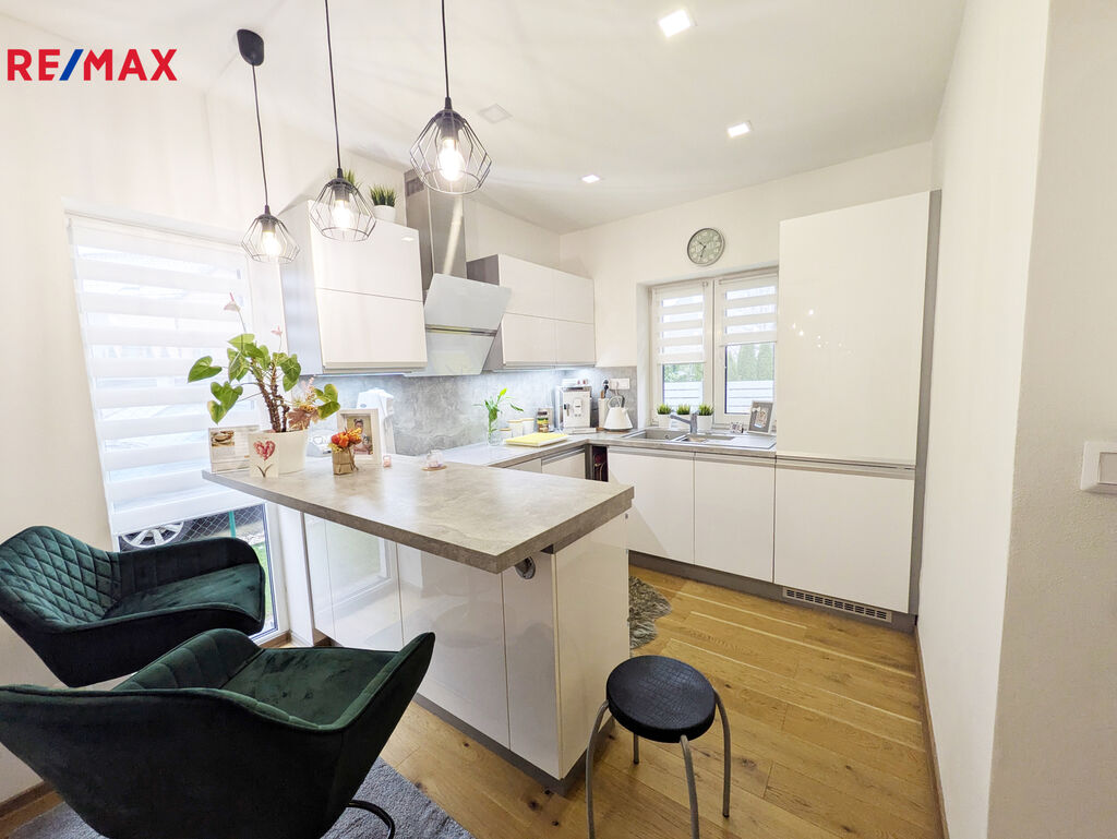 Dominantou domu je světlý obývací pokoj s kuchyňským koutem a přímým vstupem na terasu. Součástí kuchyně je nová kuchyňská linka vybavená základními spotřebiči včetně indukční varné desky, trouby a digestoře. Z obývací části je také vstup do prosklené verandy, která vede přímo na zahradu. Pozemek o výměře 377 m² je obdélníkového tvaru, kompletně oplocen a zatravněn. Na zahradě se nachází dřevěný přístřešek na nářadí. K domu náleží také vlastní parkovací stání pro dvě vozidla.