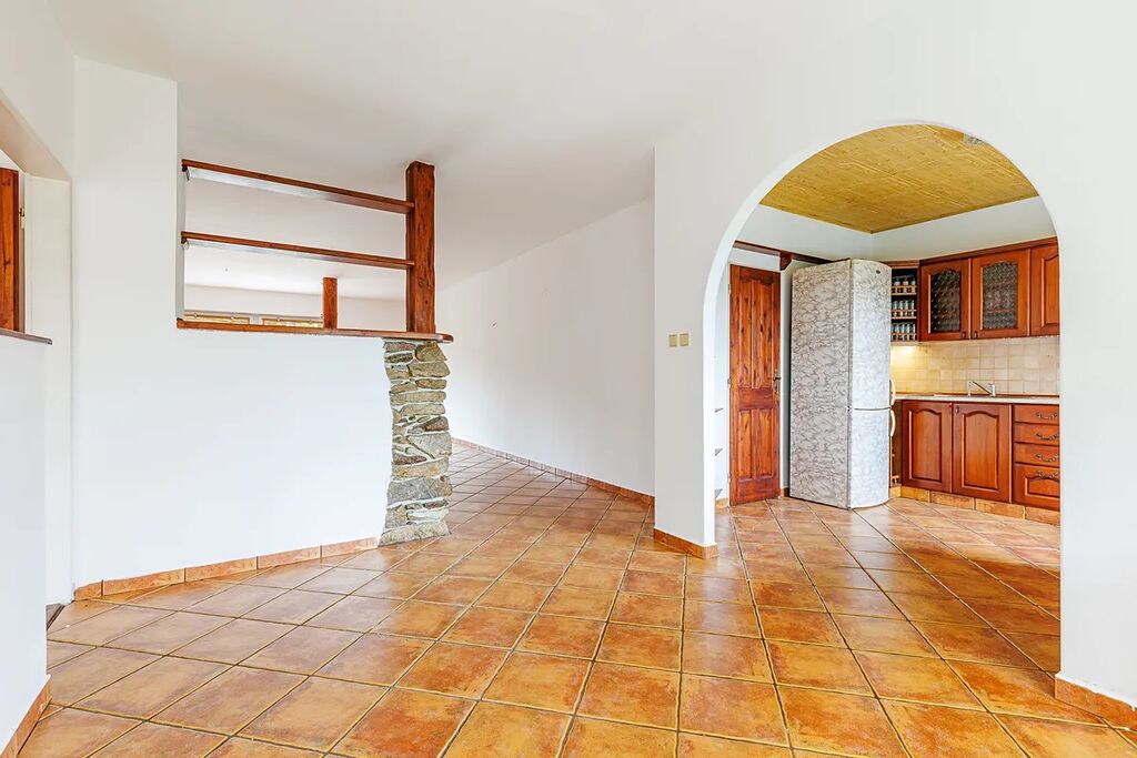 Středobodem celého domu je velký obývací pokoj 35,5 m2 s jídelním koutem 13 m2 a samostatnou kuchyní 1,8 m2 s dřevěnou kuchyňskou linkou vybavenou sporákem s horkovzdušnou troubou, nerezovým dřezem a samostatnou lednicí s mrazákem. Součástí dispozice je dále ložnice rodičů 15.5 m2 s průchozí šatnou 7,4 m2, dětský pokoj 20,2 m2, koupelna 11 m2 s vanou, masážním sprchovým koutem, umyvadlem a toaletní mísou, předsíní 4,5 m2 a vstupní halou 8,8 m2.
