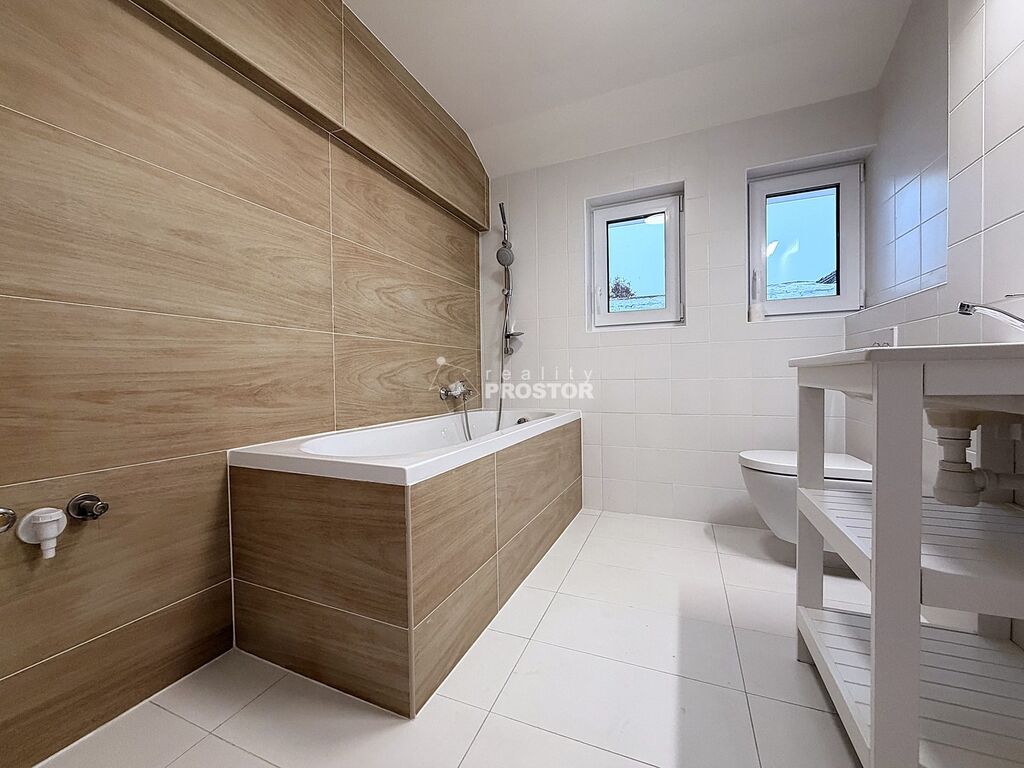 Koupelna je vybavena vanou a WC. Dominantou bytu je překrásná terasa o velikosti 22 m² s výhledem do zahrady – ideální pro relaxaci. Součástí je také půdní prostor o velikosti cca 50 m² přístupný přímo z bytu, vhodný pro úložné účely.