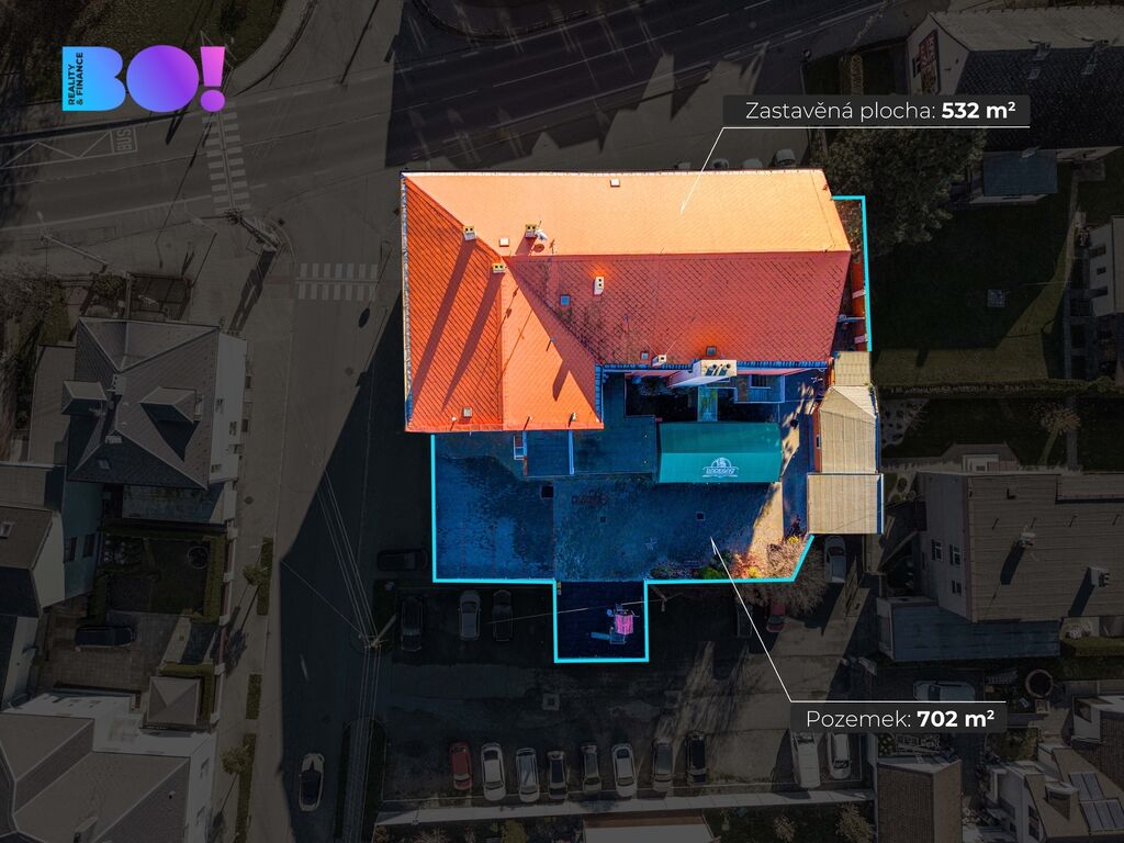 Součástí objektu je vlastní pozemek s možnosti vybudování až 23 parkovacích míst, což výrazně zvyšuje budoucí komfort rezidentů i atraktivitu