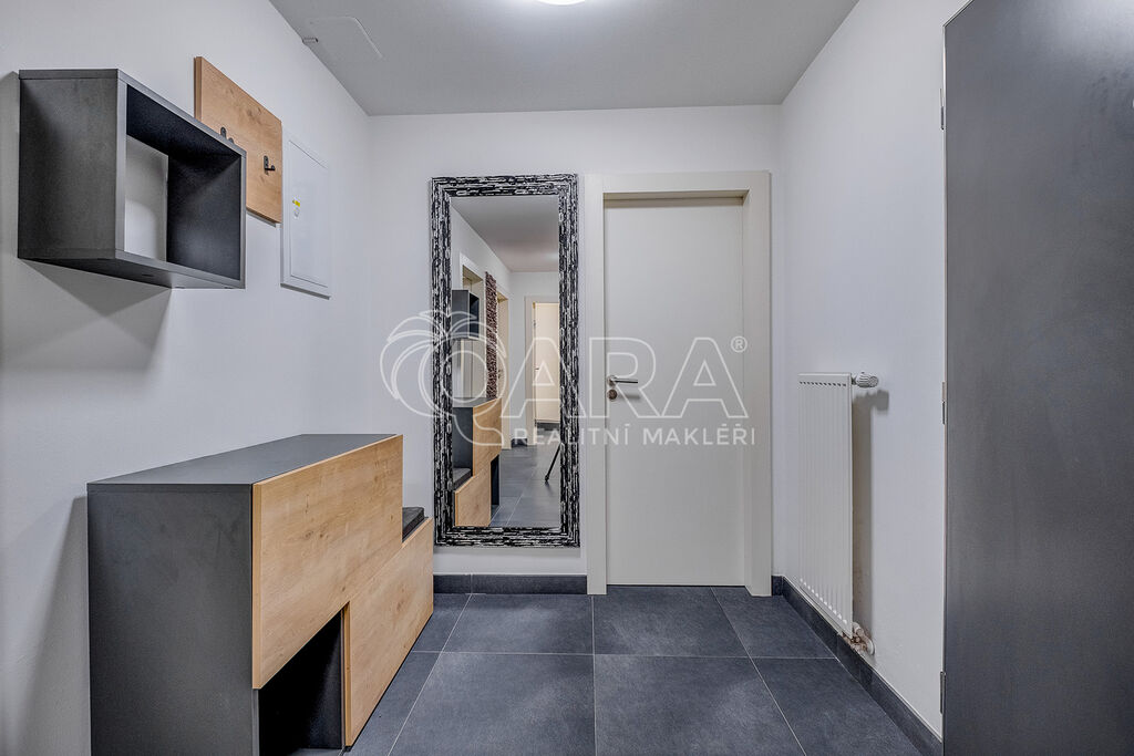 Dispozice: prostorná vstupní hala, obývací pokoj se vstupem na balkon a s vybaveným kuchyňským koutem včetně spotřebičů (el. trouba, el. sklokeramická deska, digestoř, vestavěná lednice), ložnice se samostatným vstupem včetně balkonu, koupelna s prostorným sprchovým koutem, samostatné WC. Dům je napojen na veškeré sítě a vytápění je zajištěno vlastním plynovým kotlem v rámci bytového domu, k dispozici je výtah. Byt je částečně vybaven a k dispozici je od ledna 2026.