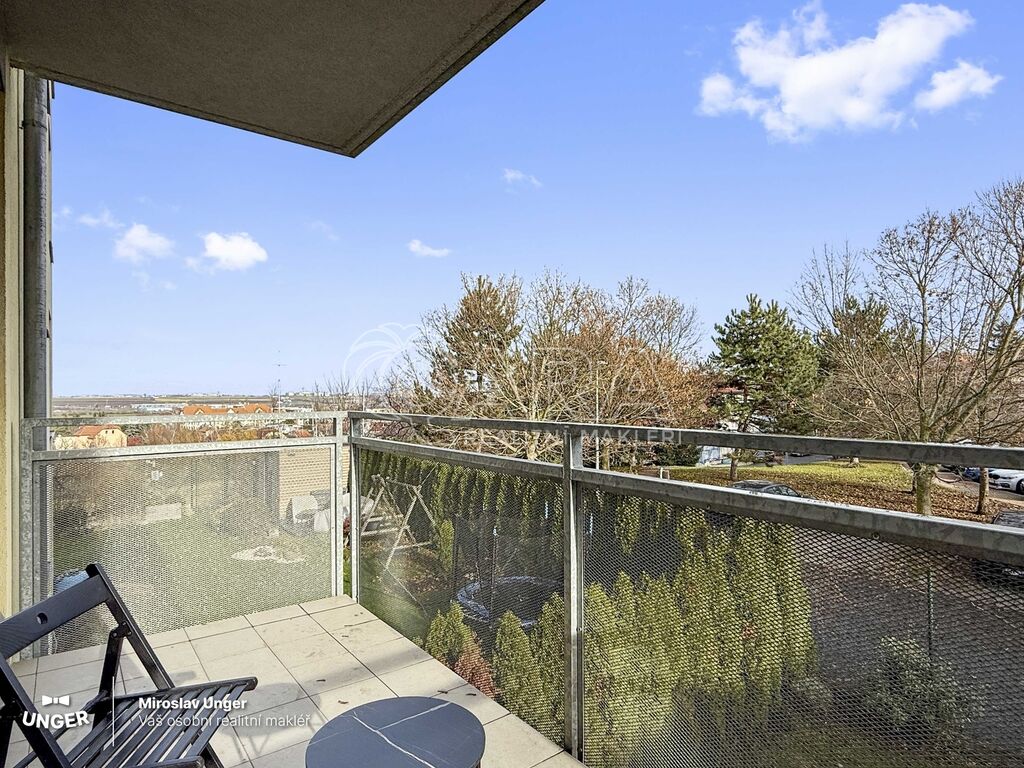 Interiér má 36,5 m² + balkon 6,3 m². Byt působí vzdušně a je v perfektním stavu. Kuchyňská linka, podlahy i masivní dřevěná eurookna jsou ve velmi dobré kondici, takže se můžete rovnou nastěhovat bez nutnosti dalších investic. Byt má velké okno se sníženým parapetem, za kterým je opravdu velký balkon, ze kterého dohlédnete až na letiště.