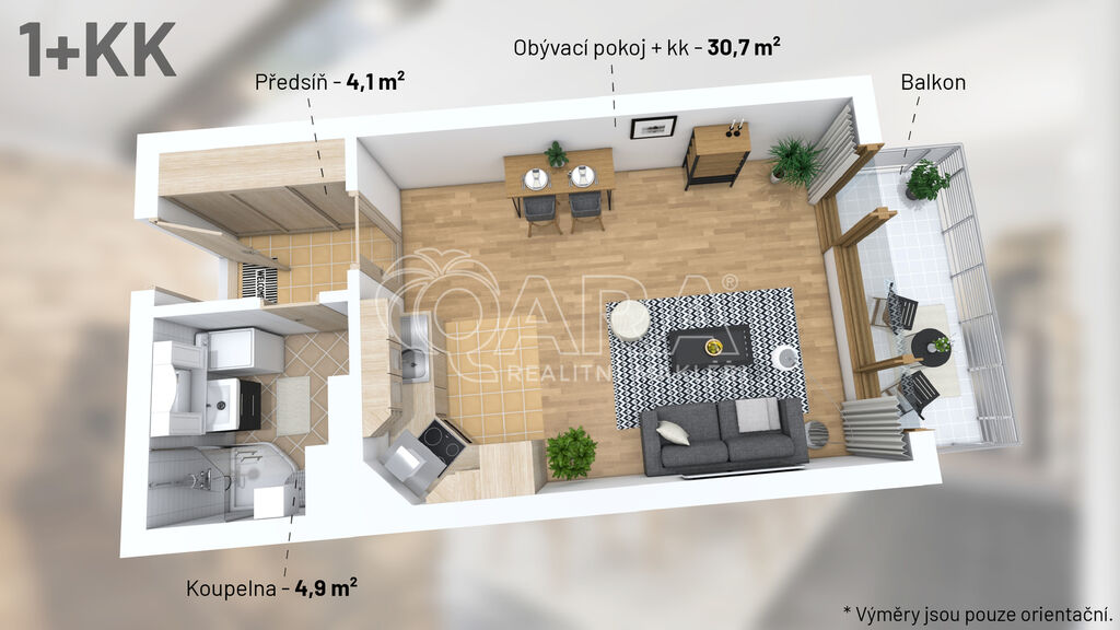 Prodej bytu 1+kk, celkem 45,8 m2 – Zličín (velikost interiéru 36,5 m2 + balkon 6,3 m2 + sklep 3 m2 + parkování v garáži)