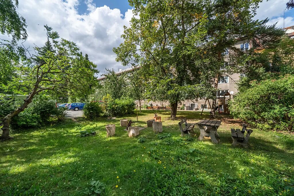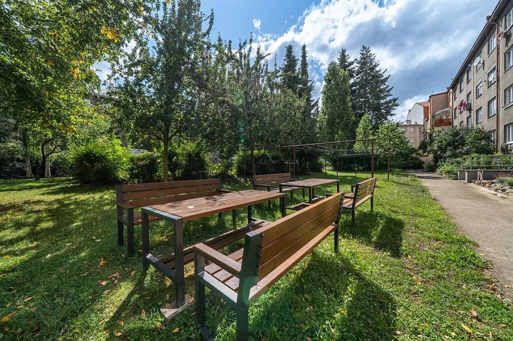 U domu se dá využít zahrada ve vnitrobloku, která je určena pro obyvatele domu – nabízí možnost posezení, grilování nebo bezpečné dětské hřiště.