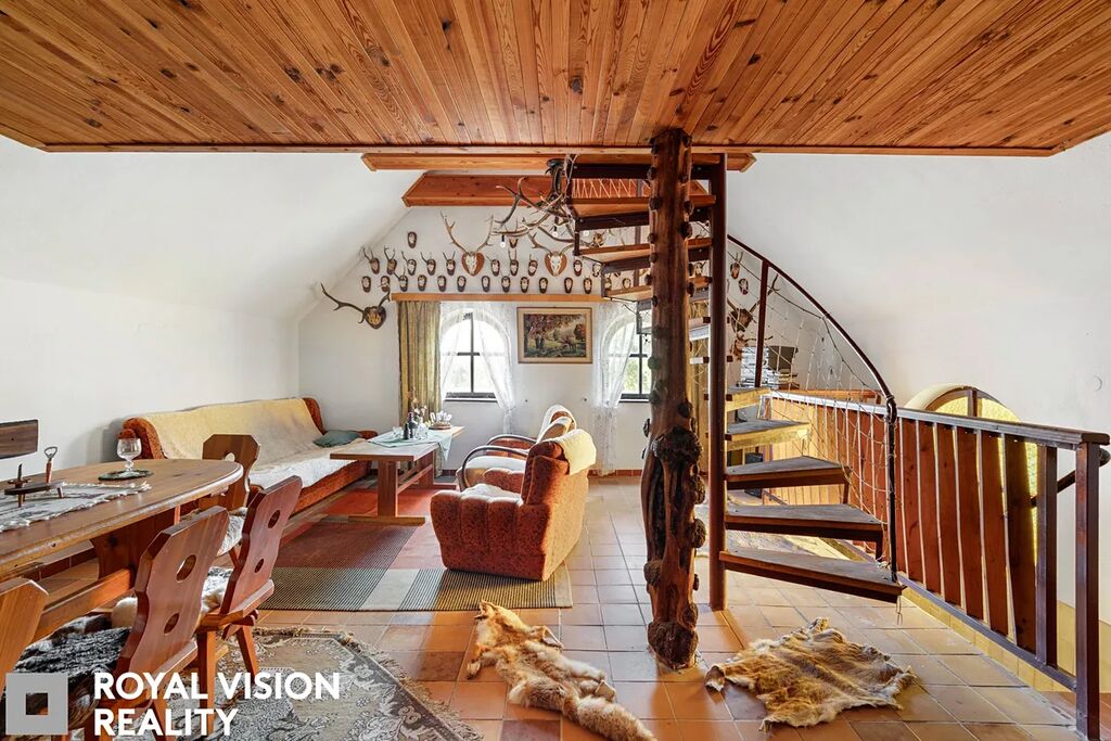 V patře je odpočinková místnost s kuchyňským koutem a otevřený podkrovní prostor určený ke spaní 45m2. Vytápění zajišťuje funkční krb, který dodává prostoru příjemnou atmosféru po celý rok.