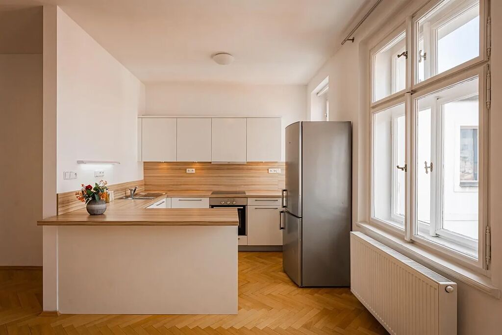 Reprezentativní prostorný byt po rekonstrukci o dispozici 2+kk, s obytnou plochou 73m2, je situovaný v 5.patře reprezentativní budovy s výtahem, v lukrativní lokalitě na Praze 1 Staré Město. Interiér bytu je nezařízený a nabízí velkolepé světlé pokoje s vysokými stropy, dispozičně se sestává ze vstupní chodby s dostatkem úložných prostor v podobě prostorných skříní, se vstupem do obývacího pokoje spojeného s moderní plně zařízenou kuchyní (sporák/trouba, lednice/mrazák, myčka, mikrovlnná trouba), dále navazuje vstup do světlé ložnice vybavené prostornou šatní skříní. Z chodby je vstup do koupelny s vanou, bidetem a toaletou, a další oddělené toalety. Podlahy tvoří kvalitní parkety a dlažba.