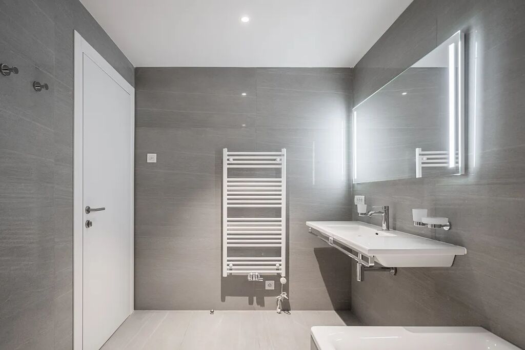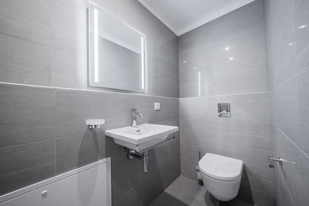 Pozn: Fotky jsou z jiného bytu v budově ve stejném standardu. Plán odpovídá bytu.