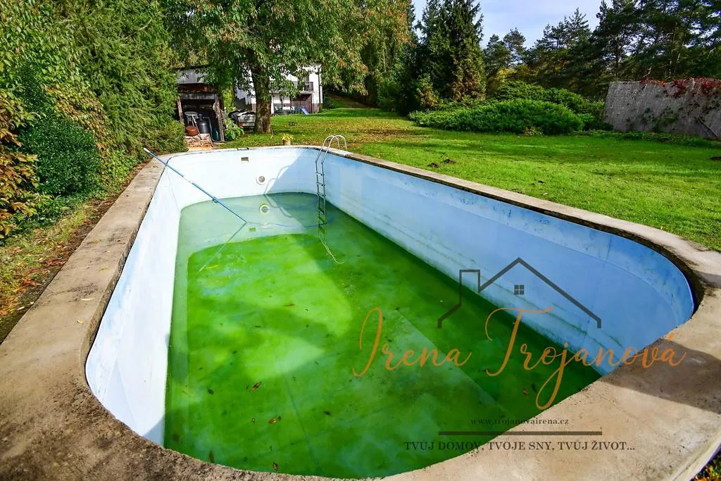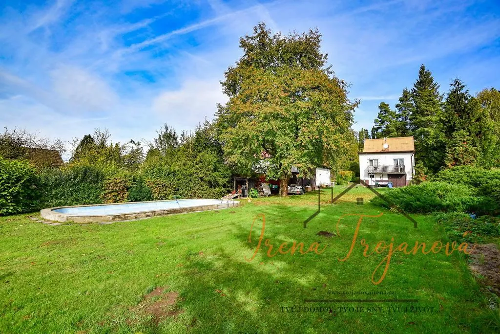 Mírně svažitý pozemek je udržovaný se vzrostlými stromy a bazénem 14x4,5 m2. Nachází se zde zděná dílna, zahradní domek, altán, 2x studna.